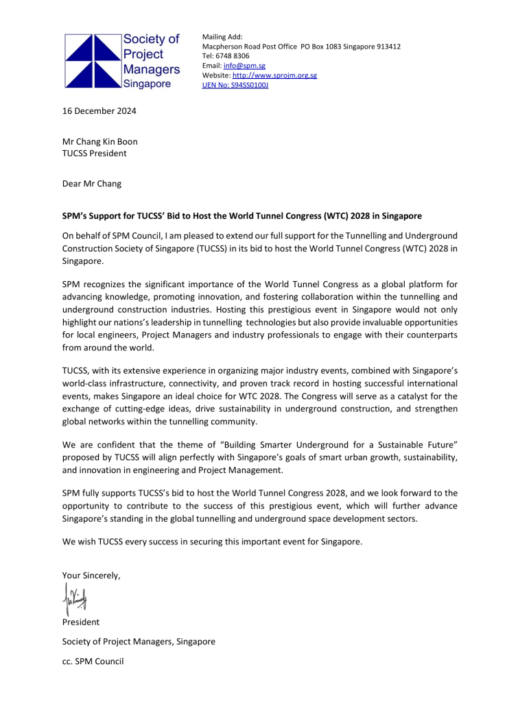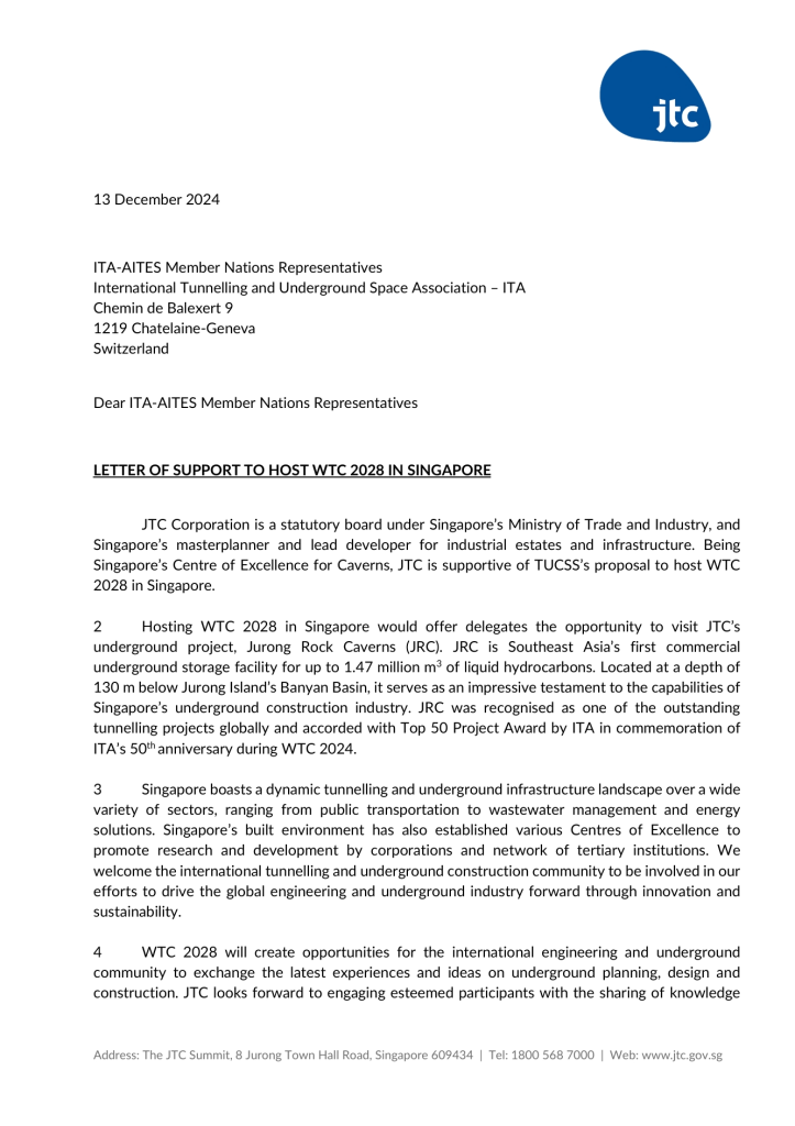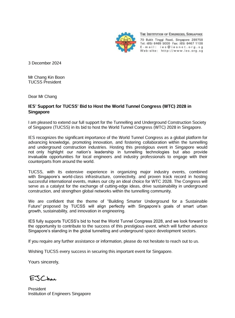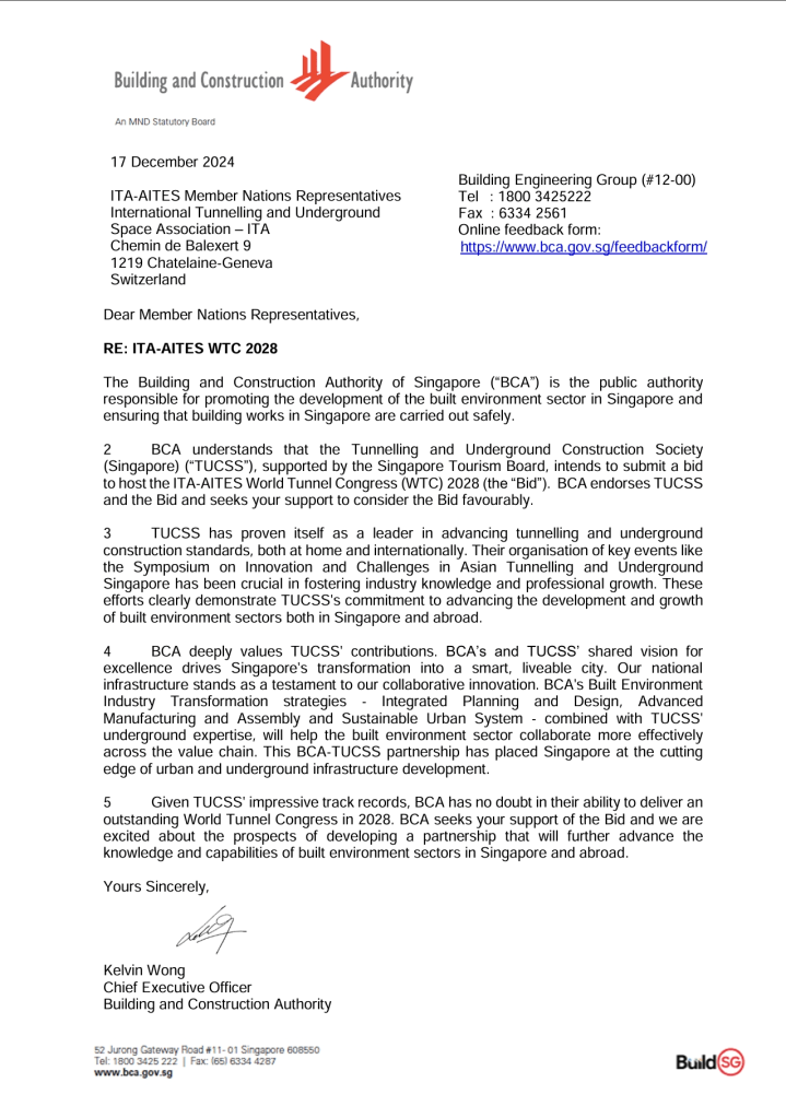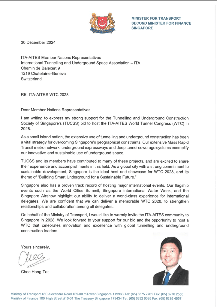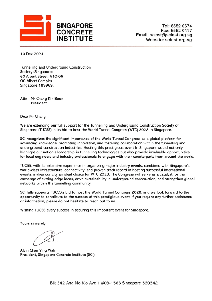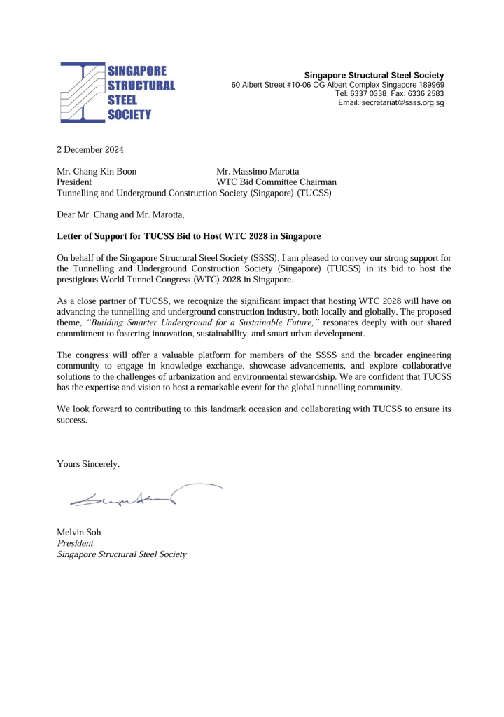 The Tunnelling and Underground Construction Society Singapore (TUCSS) has officially submitted its comprehensive proposal to host the World Tunnel Congress (WTC) 2028 in Singapore. The voting will take place during WTC 2025 in Sweden. Our website highlights the many reasons why Singapore is the ideal location to host WTC 2028, showcasing our world-class infrastructure, strong government and industry support, and commitment to innovation and sustainability in the tunneling and underground construction sector.