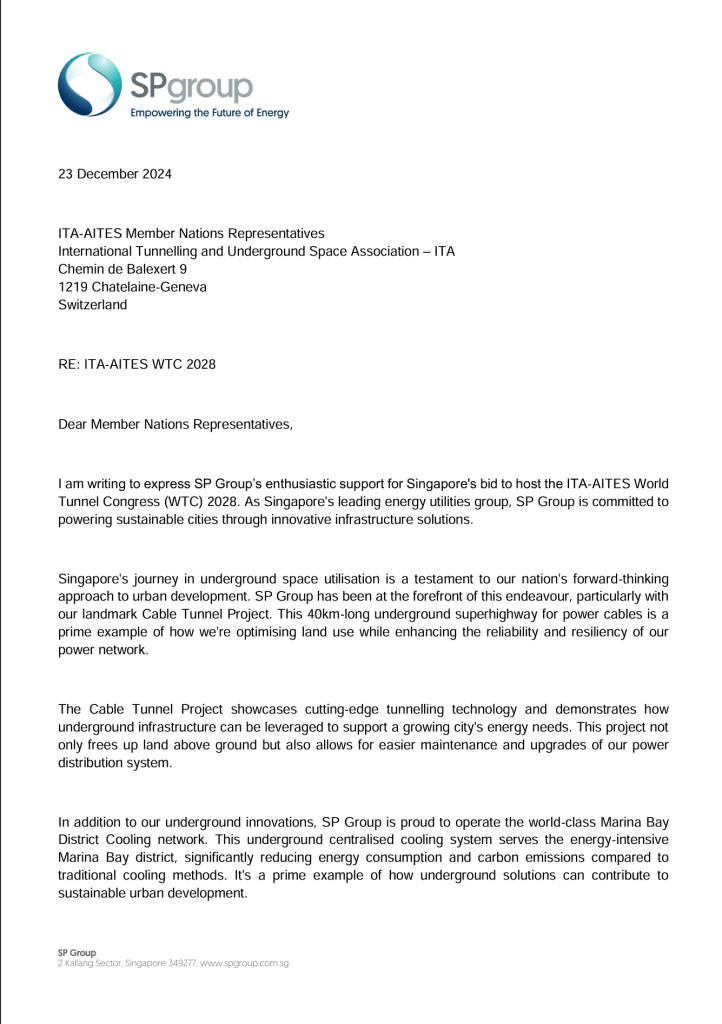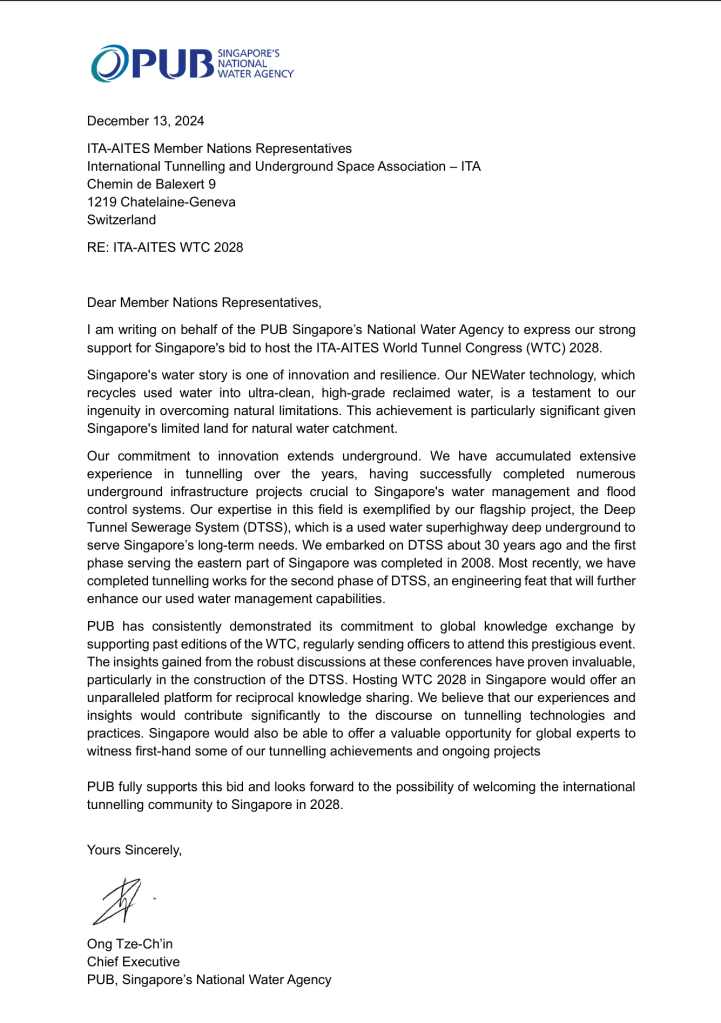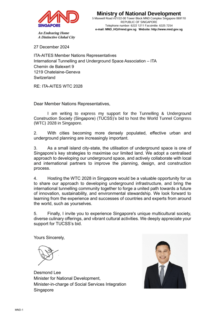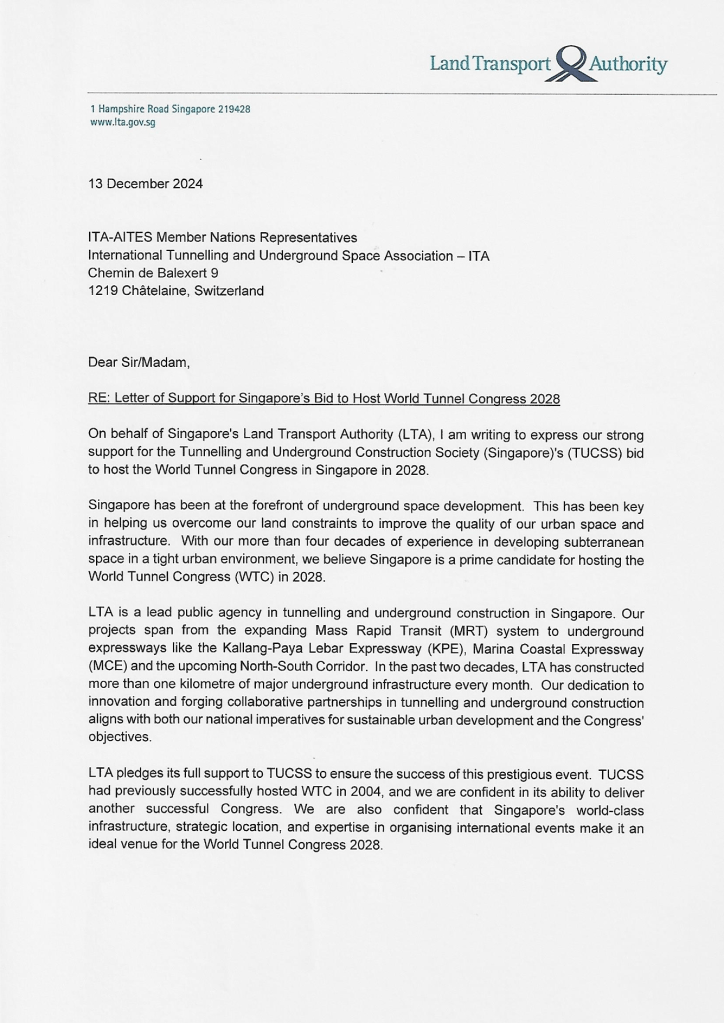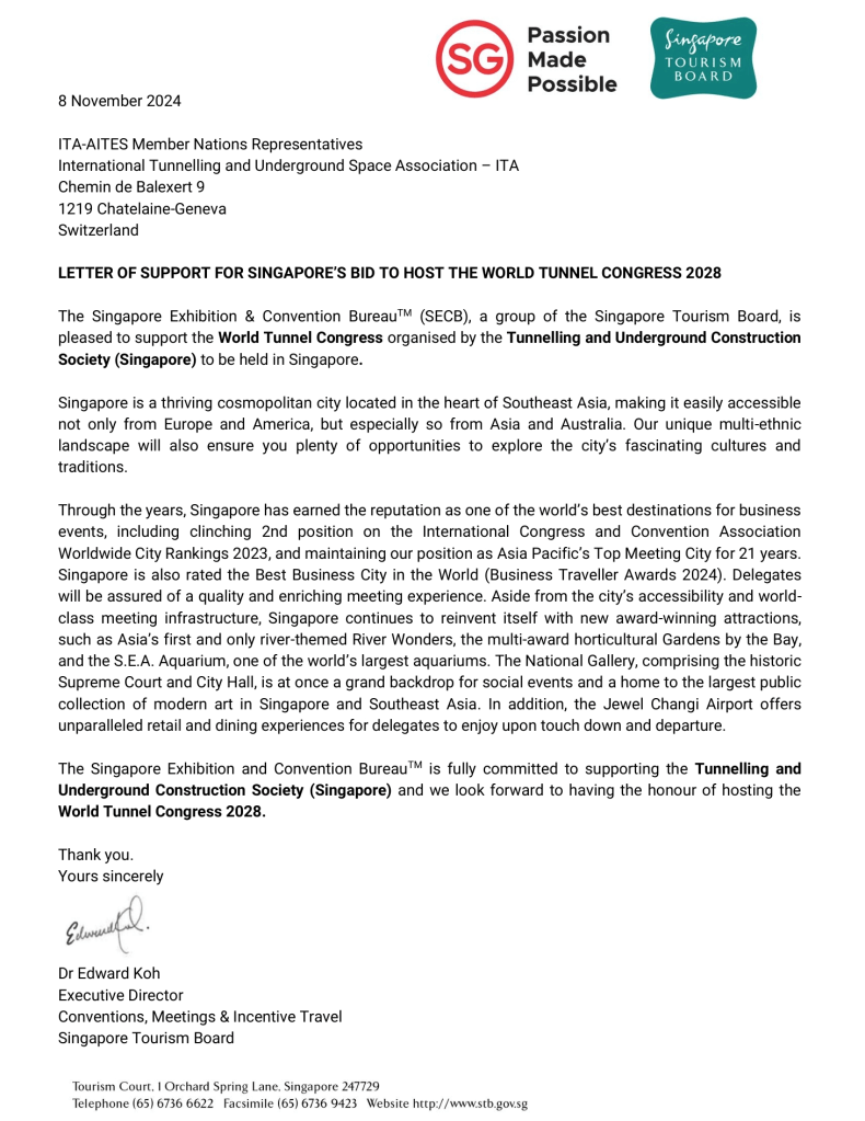 Singapore’s bid to host the World Tunnel Congress (WTC) 2028 has garnered overwhelming support from key stakeholders across the nation. Letters of endorsement have been received from prominent ministries, including the Ministry of National Development and the Ministry of Transport, as well as the Singapore Tourism Board. Government agencies such as the Building and Construction Authority (BCA), JTC Corporation, Land Transport Authority (LTA), Public Utilities Board (PUB), Singapore Power (SPPG), and Urban Redevelopment Authority (URA) have also pledged their support. Additionally, local professional associations, including the Institution of Civil Engineers Singapore, have rallied behind the bid.
